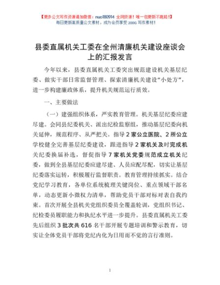 / 县委直属机关工委在全州清廉机关建设座谈会上的汇报发言