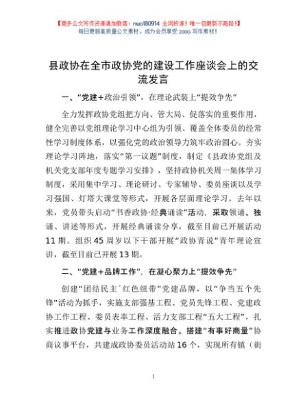 / 县政协在全市政协党的建设工作座谈会上的交流发言