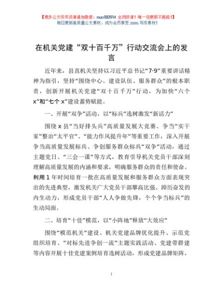/ 在机关党建“双十百千万”行动交流会上的发言