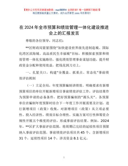 / 在2024年全市预算和绩效管理一体化建设推进会上的汇报发言