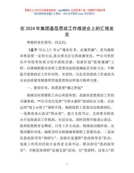 / 在2024年集团基层思政工作推进会上的汇报发言