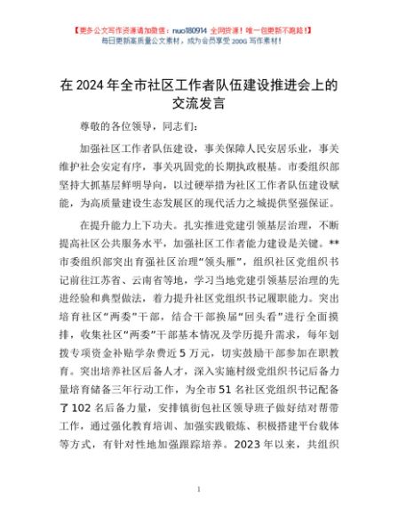 / 在2024年全市社区工作者队伍建设推进会上的交流发言