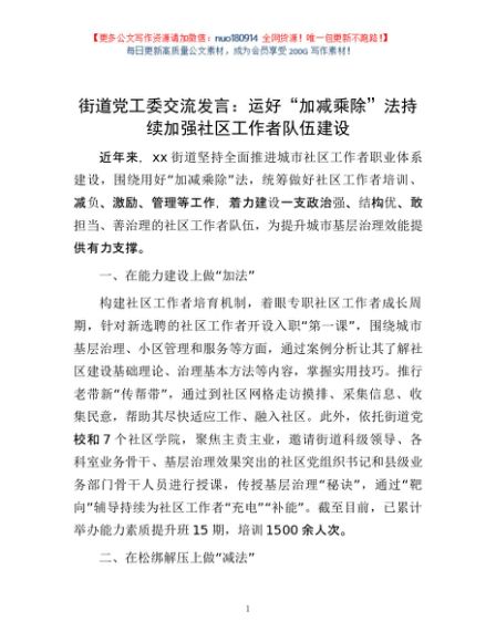/ 街道党工委交流发言:运好“加减乘除”法持续加强社区工作者队伍建设