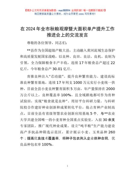 / 在2024年全市秋粮观摩暨大面积单产提升工作推进会上的交流发言