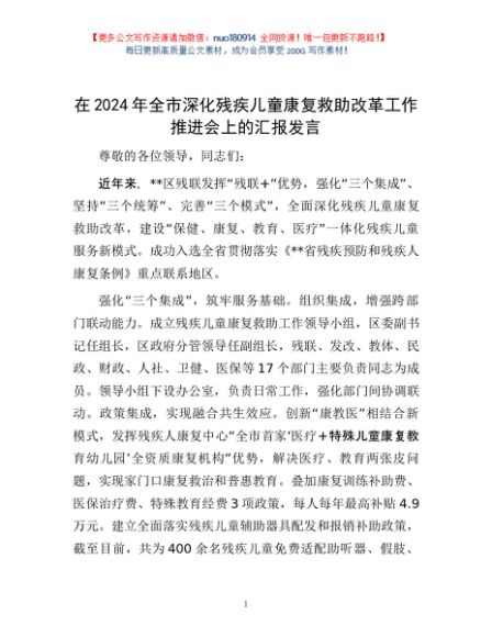 / 在2024年全市深化残疾儿童康复救助改革工作推进会上的汇报发言