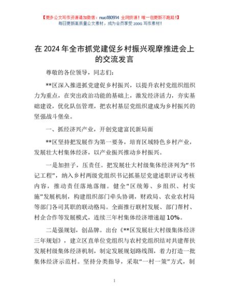 / 在2024年全市抓党建促乡村振兴观摩推进会上的交流发言