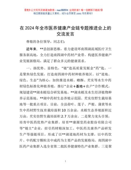 / 在2024年全市医养健康产业链专题推进会上的交流发言