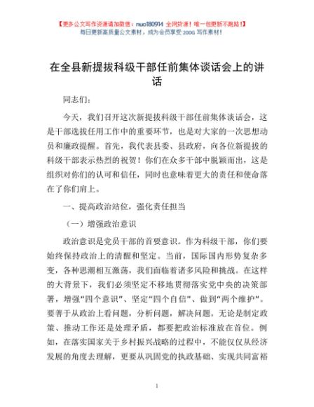 / 在全县新提拔科级干部任前集体谈话会上的讲话
