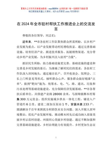 / 在2024年全市驻村帮扶工作推进会上的交流发言