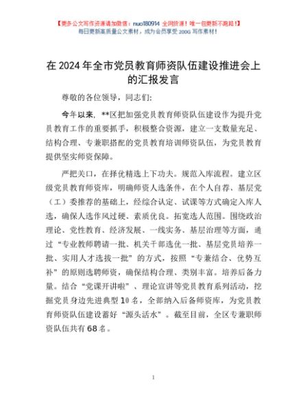 / 在2024年全市党员教育师资队伍建设推进会上的汇报发言