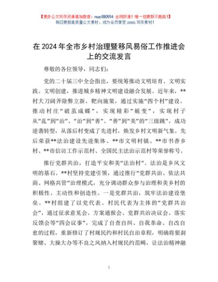 / 在2024年全市乡村治理暨移风易俗工作推进会上的交流发言
