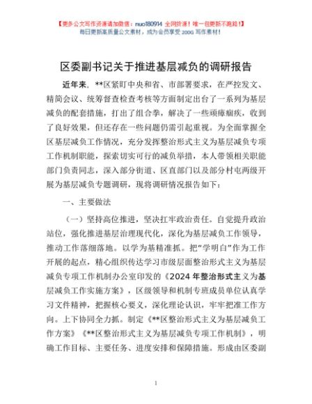 / 区委副书记关于推进基层减负的调研报告