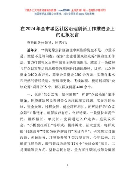 / 在2024年全市城区社区治理创新工作推进会上的汇报发言