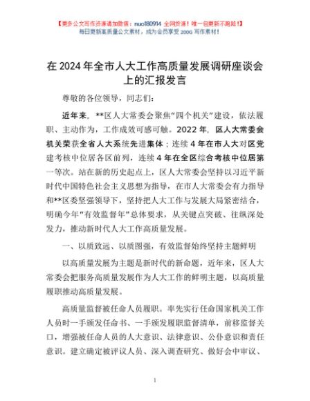 / 在2024年全市人大工作高质量发展调研座谈会上的汇报发言
