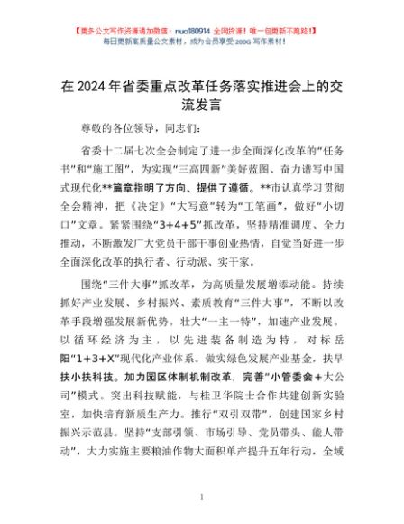 / 在2024年省委重点改革任务落实推进会上的交流发言