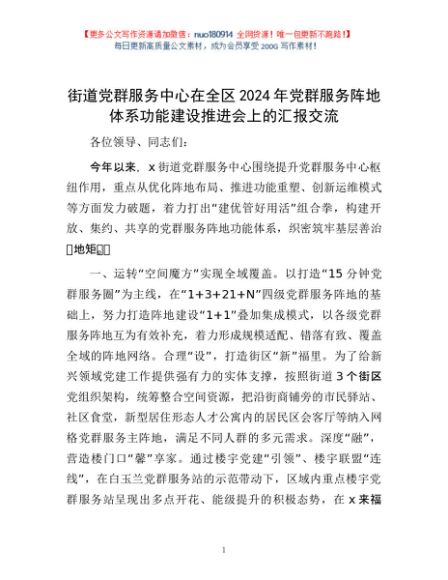 / 街道党群服务中心在全区2024年党群服务阵地体系功能建设推进会上的汇报交流