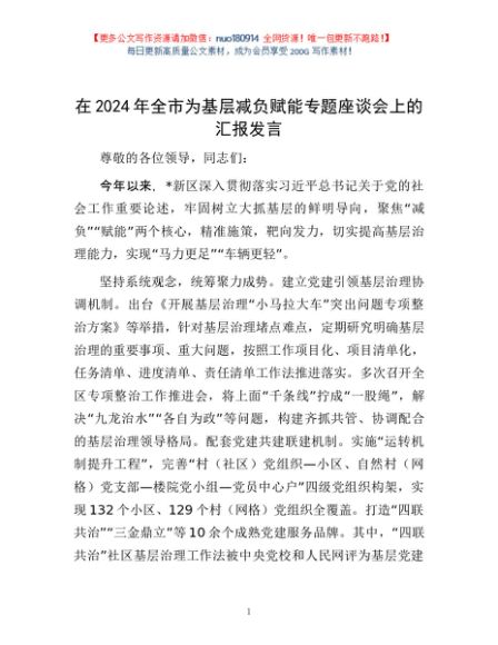 / 在2024年全市为基层减负赋能专题座谈会上的汇报发言