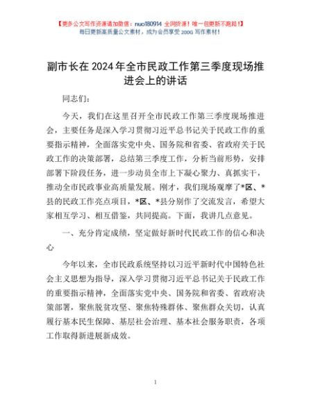 / 副市长在2024年全市民政工作第三季度现场推进会上的讲话