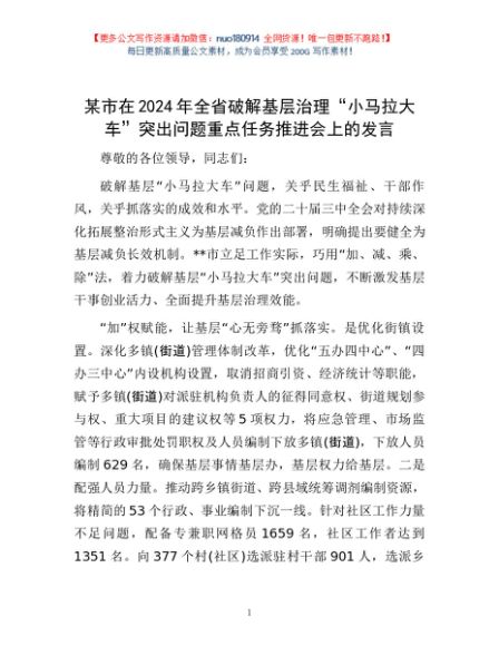 / 某市在2024年全省破解基层治理“小马拉大车”突出问题重点任务推进会上的发言