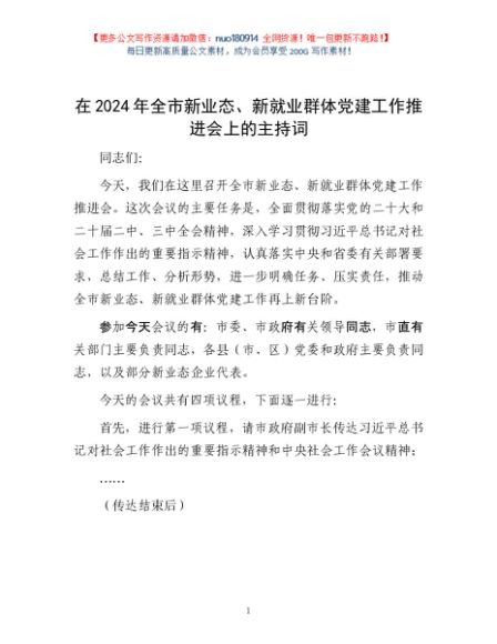 / 在2024年全市新业态、新就业群体党建工作推进会上的主持词