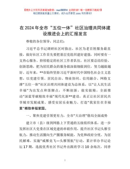 / 在2024年全市“五位一体”社区治理共同体建设推进会上的汇报发言