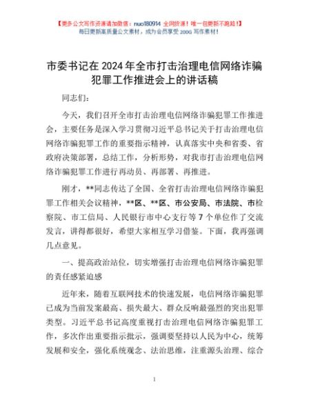 / 市委书记在2024年全市打击治理电信网络诈骗犯罪工作推进会上的讲话稿