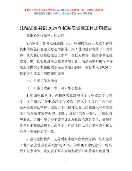 / 法院党组书记2024年抓基层党建工作述职报告