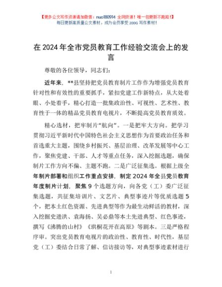 / 在2024年全市党员教育工作经验交流会上的发言