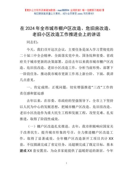 / 在2024年全市城市棚户区改造、危旧房改造、老旧小区改造工作推进会上的讲话