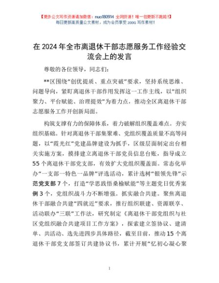 / 在2024年全市离退休干部志愿服务工作经验交流会上的发言