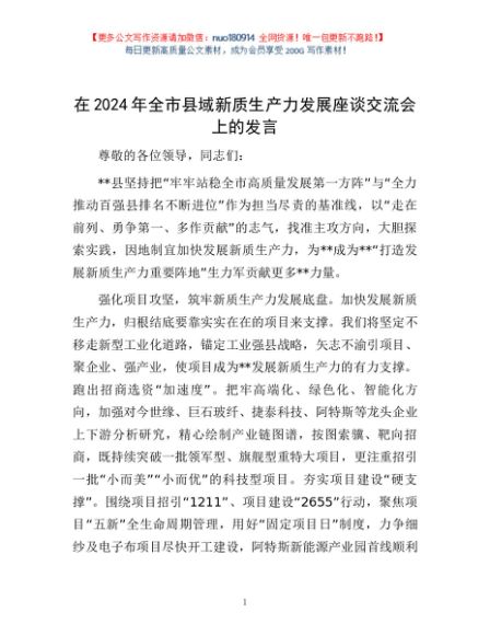/ 在2024年全市县域新质生产力发展座谈交流会上的发言