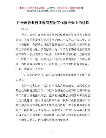 / 在全市物业行业群腐整治工作推进会上的讲话