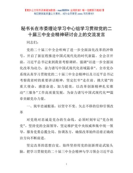 / 秘书长在市委理论学习中心组学习贯彻党的二十届三中全会精神研讨会上的交流发言