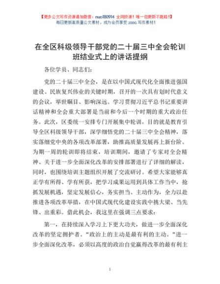 / 在全区科级领导干部党的二十届三中全会轮训班结业式上的讲话提纲