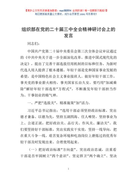 / 组织部在党的二十届三中全会精神研讨会上的发言