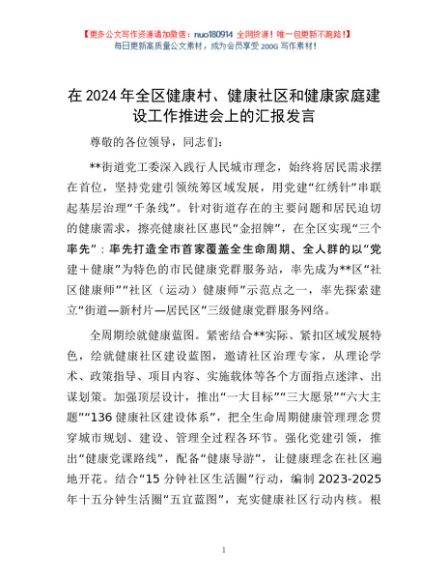 / 在2024年全区健康村、健康社区和健康家庭建设工作推进会上的汇报发言