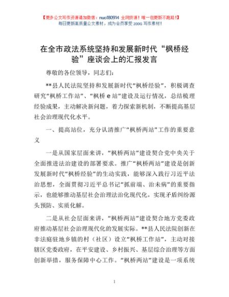 / 在全市政法系统坚持和发展新时代“枫桥经验”座谈会上的汇报发言