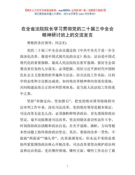 / 在全省法院院长学习贯彻党的二十届三中全会精神研讨班上的交流发言