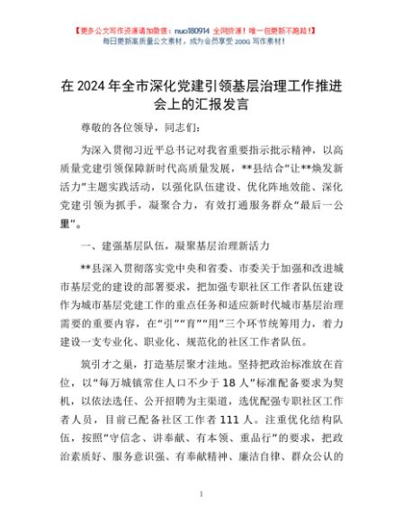 / 在2024年全市深化党建引领基层治理工作推进会上的汇报发言