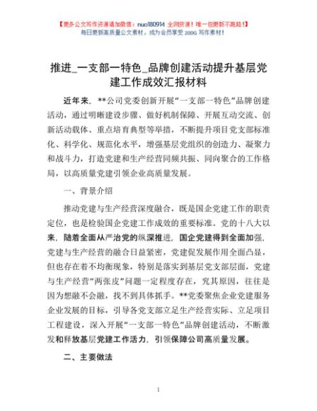/ 推进_一支部一特色_品牌创建活动提升基层党建工作成效汇报材料