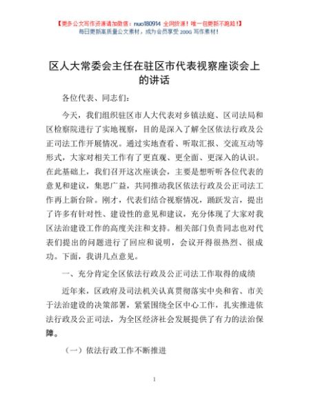 / 区人大常委会主任在驻区市代表视察座谈会上的讲话