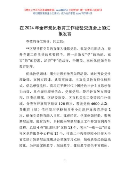 / 在2024年全市党员教育工作经验交流会上的汇报发言