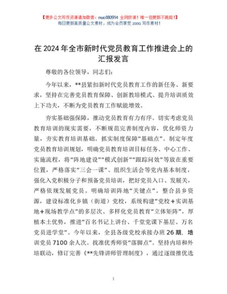 / 在2024年全市新时代党员教育工作推进会上的汇报发言