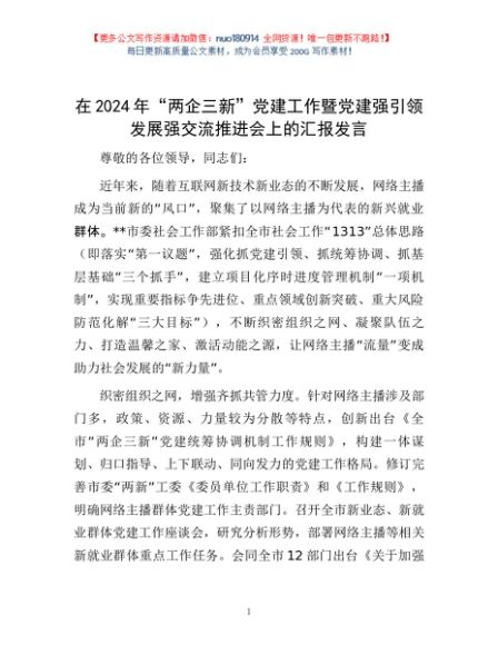 / 在2024年“两企三新”党建工作暨党建强引领发展强交流推进会上的汇报发言