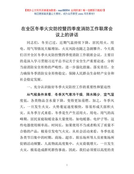 / 在全区冬季火灾防控暨四季度消防工作联席会议上的讲话