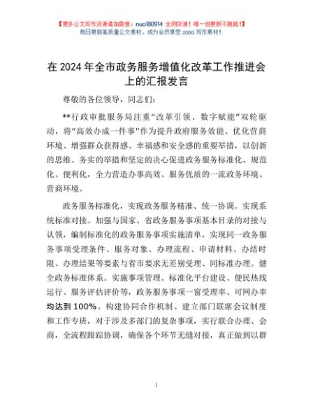 / 在2024年全市政务服务增值化改革工作推进会上的汇报发言