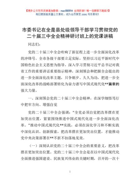 / 市委书记在全是县处级领导干部学习贯彻党的二十届三中全会精神研讨班上的党课讲稿
