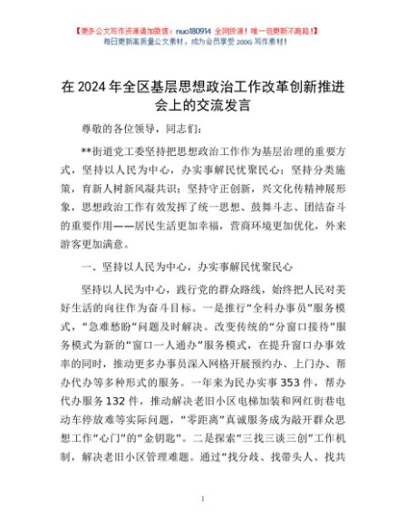 / 在2024年全区基层思想政治工作改革创新推进会上的交流发言