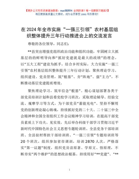 / 在2024年全市实施“一强三引领”农村基层组织整体提升三年行动推进会上的交流发言