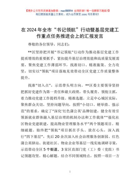 / 在2024年全市“书记领航”行动暨基层党建工作重点任务推进会上的汇报发言